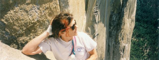 Anne emerging from the Salathe's infamous and wild 'Ear' pitch after a piece pulled and bobbed her on the head.
