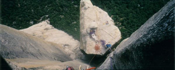 Anne kicking back on the Salathe's famed El Cap Spire.
