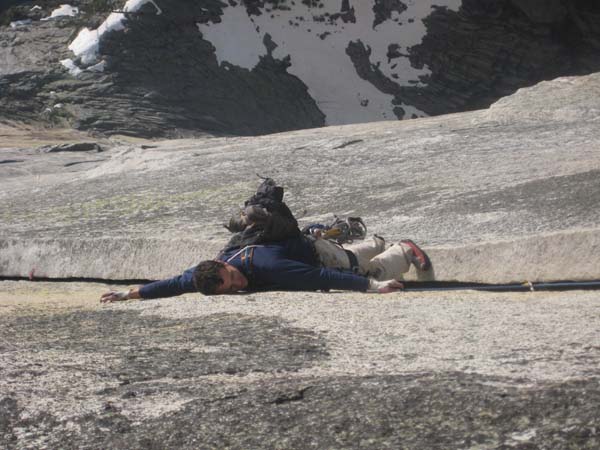 The first golden rule of big walling is not to panic at the first glitch, but when Lenny bonked before we hit the first fixed line on the approach I had to question the wisdom of that mantra. Figuring it would be easier to take his weight now rather than his body later, I took the rope while Lenny popped a gel. Instantly he snapped back to his old cheerful self and resumed singing his way up the slabs. When Lenny arrived at the anchors of pitch one with bursting forearms and puffing like a locomotive I again thought panicking would be prudent. But I soon caught on as he downed a second gel, regained his mojo, and was back on fire. Three magic gels and 23 pitches to go -- could be close.