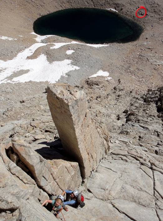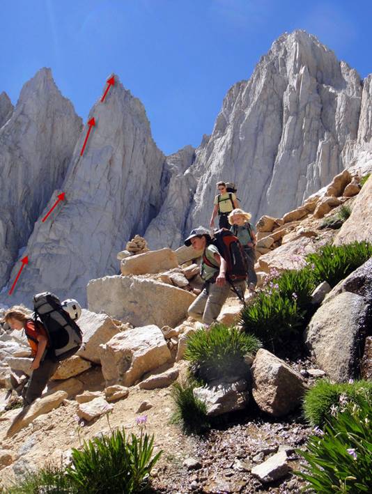 Our first objective was Mt Whitney (14,500 feet) via the East Buttress. Great climbing right from the start. Our camp is circled in red